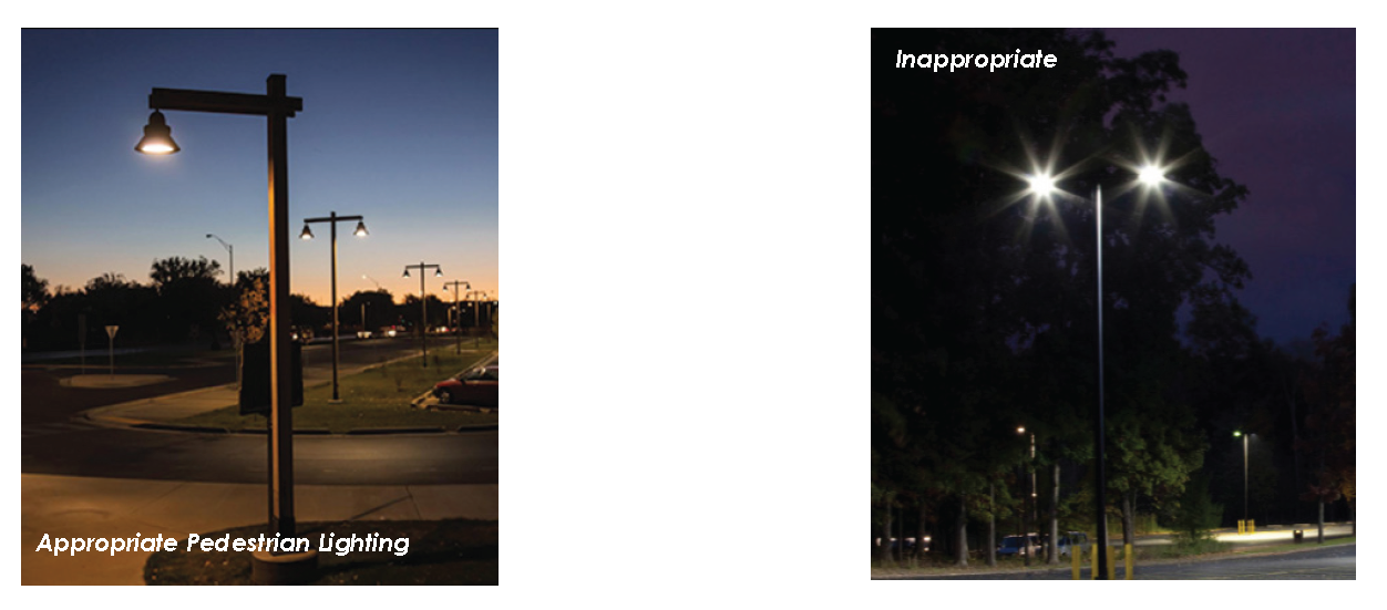 • Fixtures within pedestrian areas, along sidewalks and walkways may be no higher than eight feet.