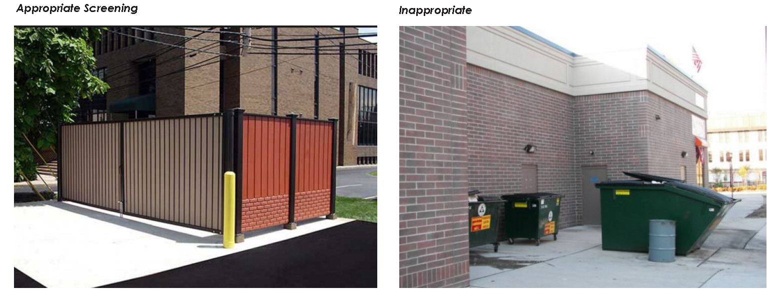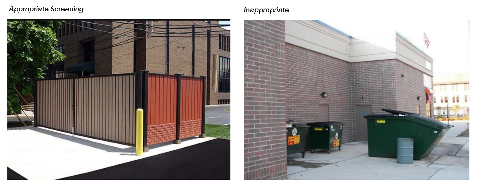 • Loading and refuse areas are adequately screened such that they are not visible from adjacent rights-of-way and abutting properties.