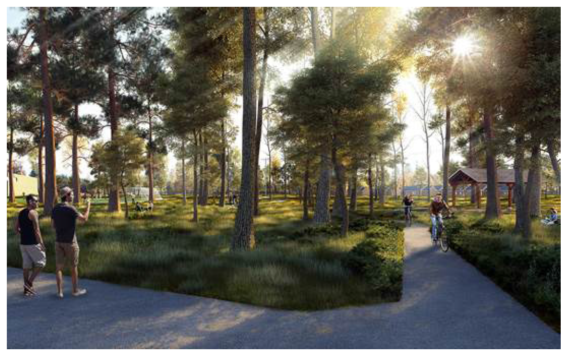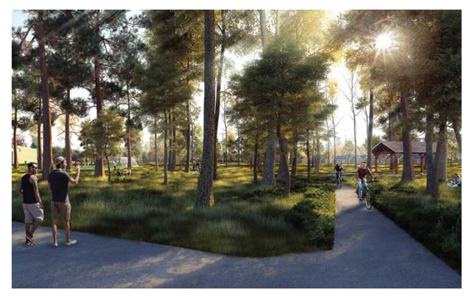 The northern area is defined by +30-acre parcel fronting Floyd Avenue and the Mohawk River (north of the electrical transmission right-of-way), and includes the Floyd Avenue commercial corridor from just west of the Mohawk River bridge stretching to Griffiss Business and Technology Park; where the plan prescribes mixed-uses including commercial, residential, and recreation. The multi-story buildings on the 30 acre parcel should front on Floyd Avenue, extending the existing commercial corridor and paying close attention to the streetscape aesthetic. Proposed buildings should extend along the Woodhaven entrance drive as much as practical to pull the streetscape aesthetic interior to the site. The western building should, ideally, interact with the Mohawk River, engaging the public riverfront and trail. Commercial activities should be encouraged to spill outside the building by providing semi-private patios and outdoor spaces that maximize the interplay of humans and nature. Pedestrian connections and outdoor amenities are vital components of any site plan proposed for the northern section.