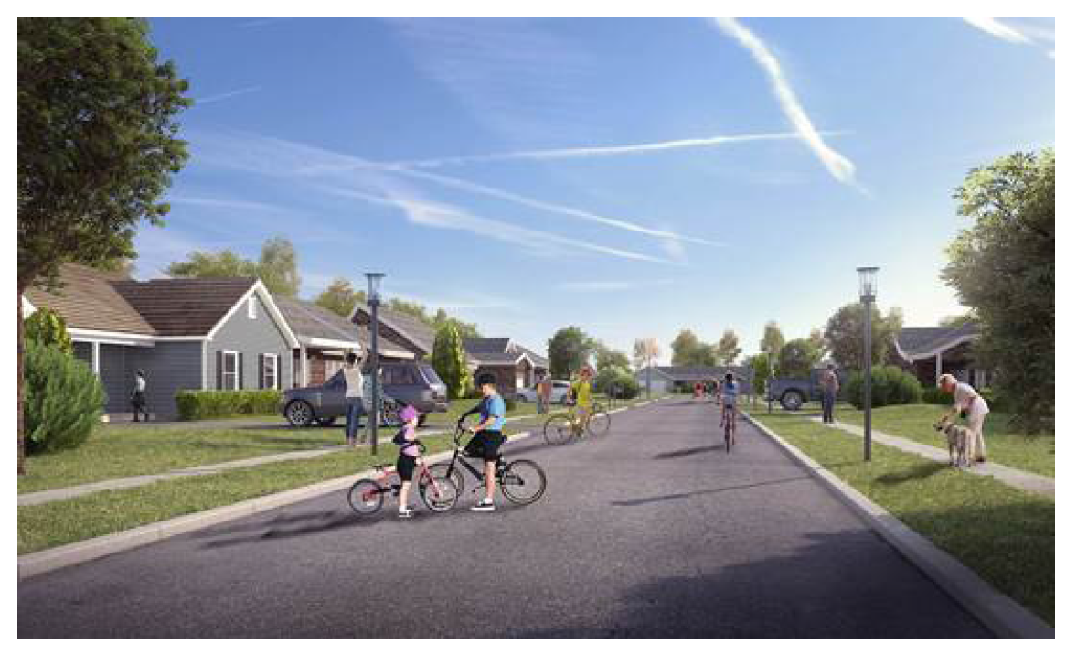 The central area, between the overhead electrical transmission lines and the realigned Park Drive, provides for flexibility to potential developers. This subarea provides a balance between the community's desire for single-family housing with the desire for natural or open space areas and trails. This subarea allows for flexibility to subdivide or sell acreage as the market demands. The style of this development within this subarea should include small lots consistent with lot sizes in the adjacent neighborhoods. Sidewalks and trail spurs must be included to enhance pedestrian and bicycle connectivity and accessibility for the mobility impaired.
