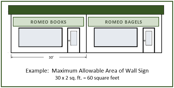 For the purposes of this Ordinance, the following words shall have the associated definitions ascribed to them. Words not defined shall be given their common and ordinary meaning. Abandoned Sign – A sign that remains in place and continues to advertise a business, service, owner, product, or activity that has ceased operations or has closed for thirty (30) days or more, or pertains to a time, event, or purpose which no longer applies. Attached Sign – Any sign affixed to, applied on, or supported by any part of a building located on premise. Awning Sign – A permanent sign that is directly applied, attached, or painted onto an awning, which is a projection, shelter, or structure of canvas, metal, wood, or other similar approved material that covers a pedestrian walkway and is intended for protection from the weather or as a decorative architectural feature. Banner Sign – A temporary attached sign having characters, letters, or illustrations applied to plastic, cloth, canvas, or other light fabric, with the only purpose of such non-rigid material being for background. Billboard Sign – A large freestanding sign, generally supported by a metal frame, and consisting of two (2) parallel sign faces which are oriented in opposite directions, used for the display of posters, printed, or painted advertisements that generally directs attention to a location other than the premise on which the sign is located. Changeable Electronic Message/Reader Board Component or Sign – A permanent sign or portion of a permanent sign designed to allow advertising or wording to be changed at periodic intervals, either manually or electronically, and is operated whereby light is turned on and off intermittently. Commercial Center – A commercial building comprised of multiple, individual businesses on a single lot where the primary entrance for each tenant is generally accessed from the outside. Façade – Any separate face of a building, including parapet walls and omitted wall lines, or any part of a building which encloses or covers usable space. Where separate faces are oriented in the same direction, or in directions within forty-five (45) degrees of one another, they are to be considered as part of a single façade. Flag – A piece of fabric attached to a staff or cord on one (1) end and generally used as a symbol of a nation, state, political subdivision, or organization. Flagpole – A freestanding device permanently placed in the ground for the purpose of flying a flag of a nation, state, political subdivision, or organization. Government/Regulatory Sign – A sign for the control of traffic or for identification purposes, street signs, warning signs, railroad crossing signs, and signs of public utility and service companies indicating danger or construction, which are erected by or upon the order of a public officer, employee or agent thereof, in the discharge of official duties. Ground Sign – A permanent freestanding sign that is supported from grade to the bottom of the sign, having or appearing to have a solid and opaque base independent of the principle building or structure, and is generally used to identify the name of a business and/or development on the property. Inflatable Sign – A temporary sign manufactured of plastic, cloth, canvas, or other light fabric and inflated with air. Mechanical Sign – Any sign, which rotates, shakes, or moves by means of a motor, battery, or the like. Nonconforming Sign – A sign and its supporting structure which do not conform to all or part of the provisions of this Ordinance. Pole Sign – A freestanding sign, which is constructed on a vertical framework consisting of one (1) or more upright supports, secured in the ground. Portable Sign – Any sign not permanently attached to the ground or to a building, which is designed to be easily transported or conveyed to different locations. This term includes, but is not limited to, signs on wheels or affixed to trailers or skids, tent signs, sandwich board (A-frame) signs, T-shaped signs, airborne signs, and similar devices. Projecting Sign – A permanent attached sign that is wholly or partially dependent upon a building for support and extends more than twelve inches (12”) from said building, generally at a right angle. Revolving Sign – A sign that turns, spins, partially revolves, or completely revolves 360 degrees on an axis. Roof Sign – A sign mounted on and supported by the roof portion of a building, above the uppermost edge of a parapet wall and is supported by the building, or a sign that is painted directly upon the roof or top of a building. Sandwich Board (A-frame) Sign – A portable sign consisting of two (2) panels of equal size, which are hinged at the top and placed on the ground or pavement so as to be self-supporting. Sign – Any form of communication which directs attention to an individual, business, commodity, service, activity, or product, by means of words, figures, numerals, emblems, devices, trade names, or trademarks, or other pictorial matter that communicates information of any kind to the public. Sign Area – The area of the sign that is utilized for the display of information to include background, however, does not include the framework or base of the sign. Variance – An official authorization from the Village of Romeo Zoning Board of Appeals used to allow exceptions to regulations or requirements of this Ordinance. Vehicular Sign – A sign painted upon or applied directly to (including magnetic) any truck, car, bus, trailer, boat, recreational vehicle, motorcycle, or other vehicle. Vehicular signs shall exclude bumper stickers, license plates, and inspection and registration stickers. Wall Sign – A permanent sign affixed to or painted on an exterior wall and extending not more than twelve inches (12”) from the façade of any building to which it is attached, supported throughout its entire length by the building face. Wind Device – Any pennant flag,