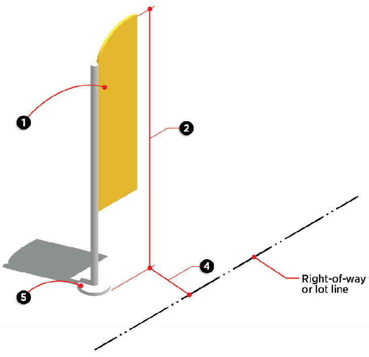 Location. Feather signs shall be located a minimum of five feet from all property lines, rights-of-way, and utility easements; shall not block points of ingress or egress; be placed in any sidewalk or pedestrian walkway and shall not be located in a clear vision triangle as detailed in section 15-520.