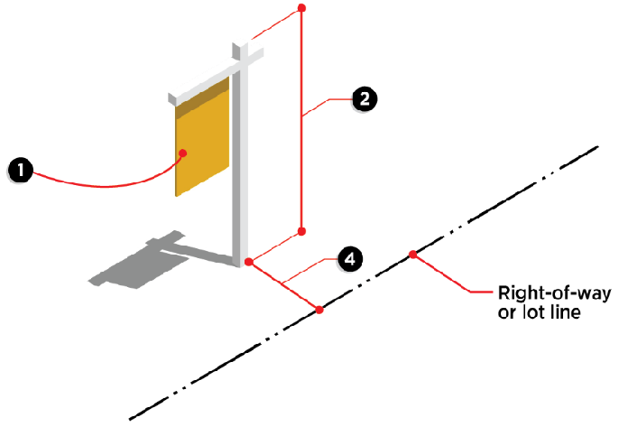 Location. Yard signs shall be located a minimum of five feet from all property lines, rights-of-way, and utility easements; shall not block points of ingress or egress; be placed in any sidewalk or pedestrian walkway and shall not be located in a clear vision triangle as detailed in section 15-520.