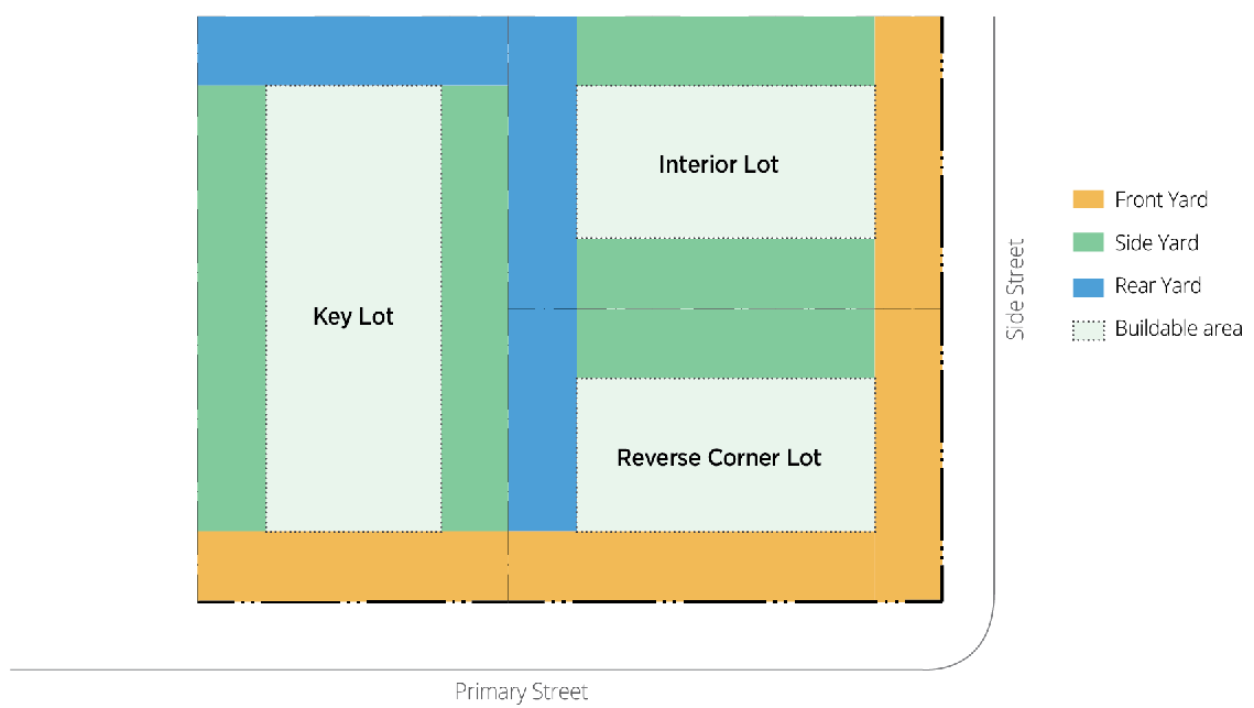 On a reverse street corner lot, a lone accessory structure shall not be located closer to the rear property line than the required side yard of the adjoining key lot and not closer to the street than the required front yard of the adjoining key lot.