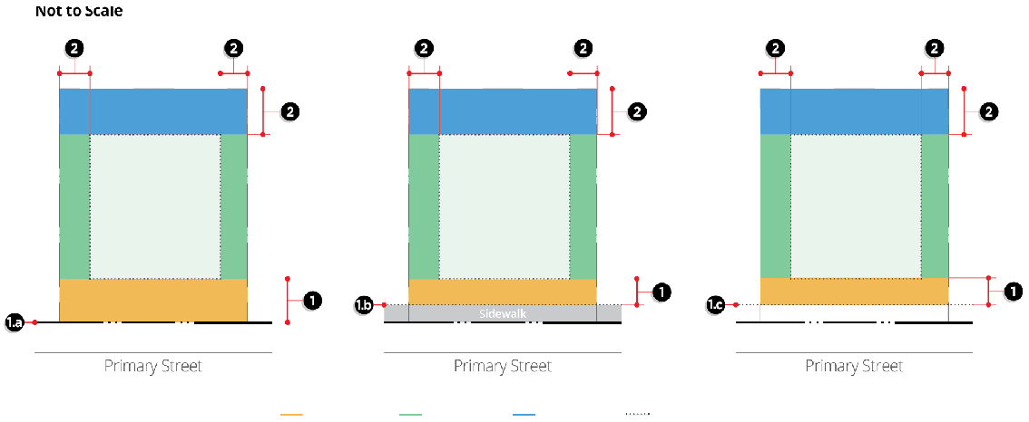 A required front yard shall be measured as the shortest distance between the building and the following edge, using whichever edge is the most restrictive requirement (i.e., using whichever edge establishes the building farthest from the street, sidewalk, or easement):
