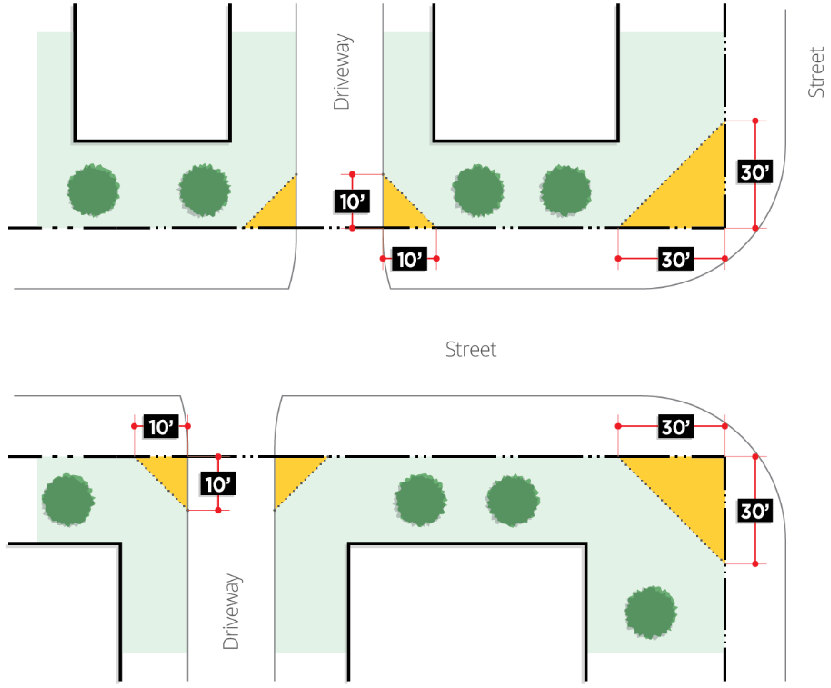 Driveways. For driveways, a vision triangle extending ten feet along the lot line and ten feet along the driveway starting at the intersection of the lot line and the closest edge of the driveway and connected by a straight line to form a triangular area shall be maintained.