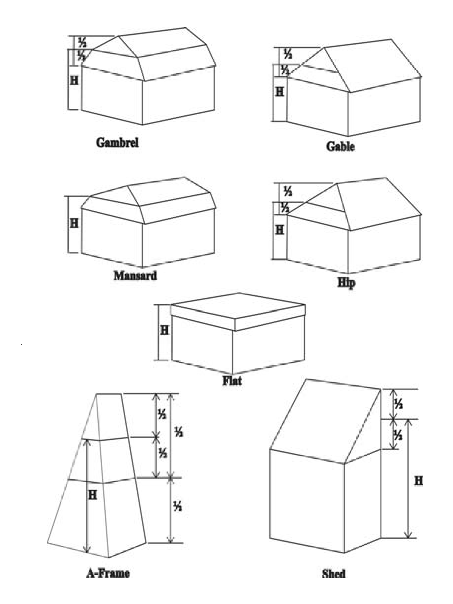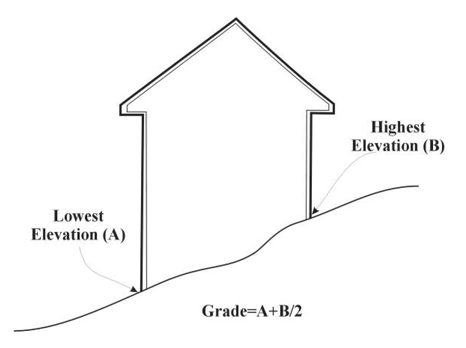 Building height means the vertical distance measured from the established grade at the center of the front (location of main entrance) of the building to the highest point of the roof surface for flat roofs; to the deck line of mansard roofs; and to the average height between eaves and ridge for gable, hip, and gambrel roofs; and the average height between the lowest point and the highest point on a shed roof. Where a building is located on sloping terrain, the height may be measured from the average ground level of the grade at the building wall.