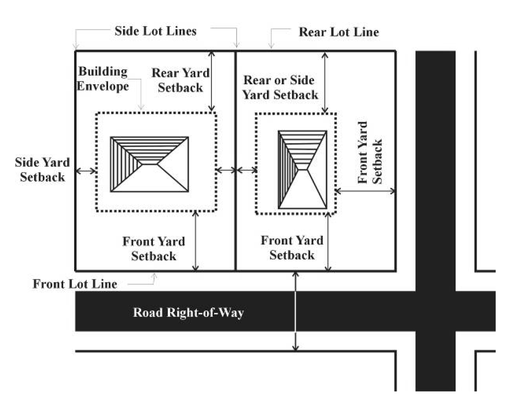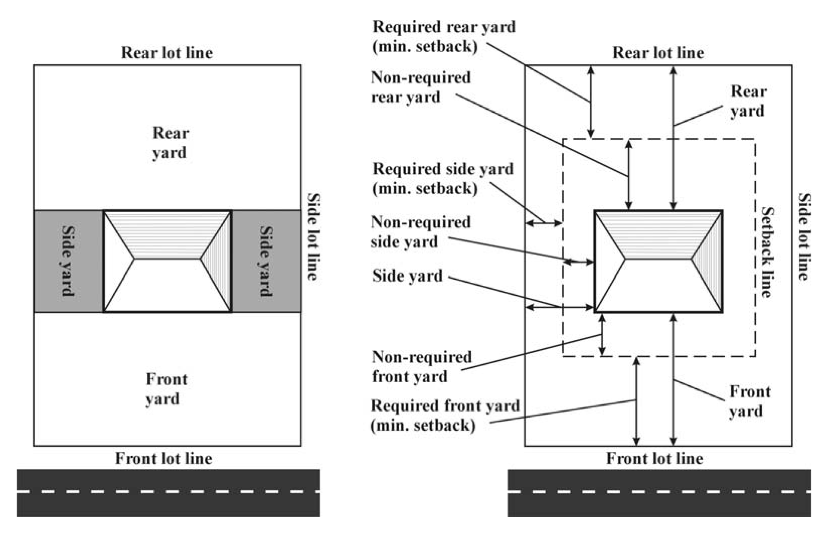 Required yard means the open space between the lot line and the minimum setback line. The required yard corresponds to the minimum setback requirement for the district.