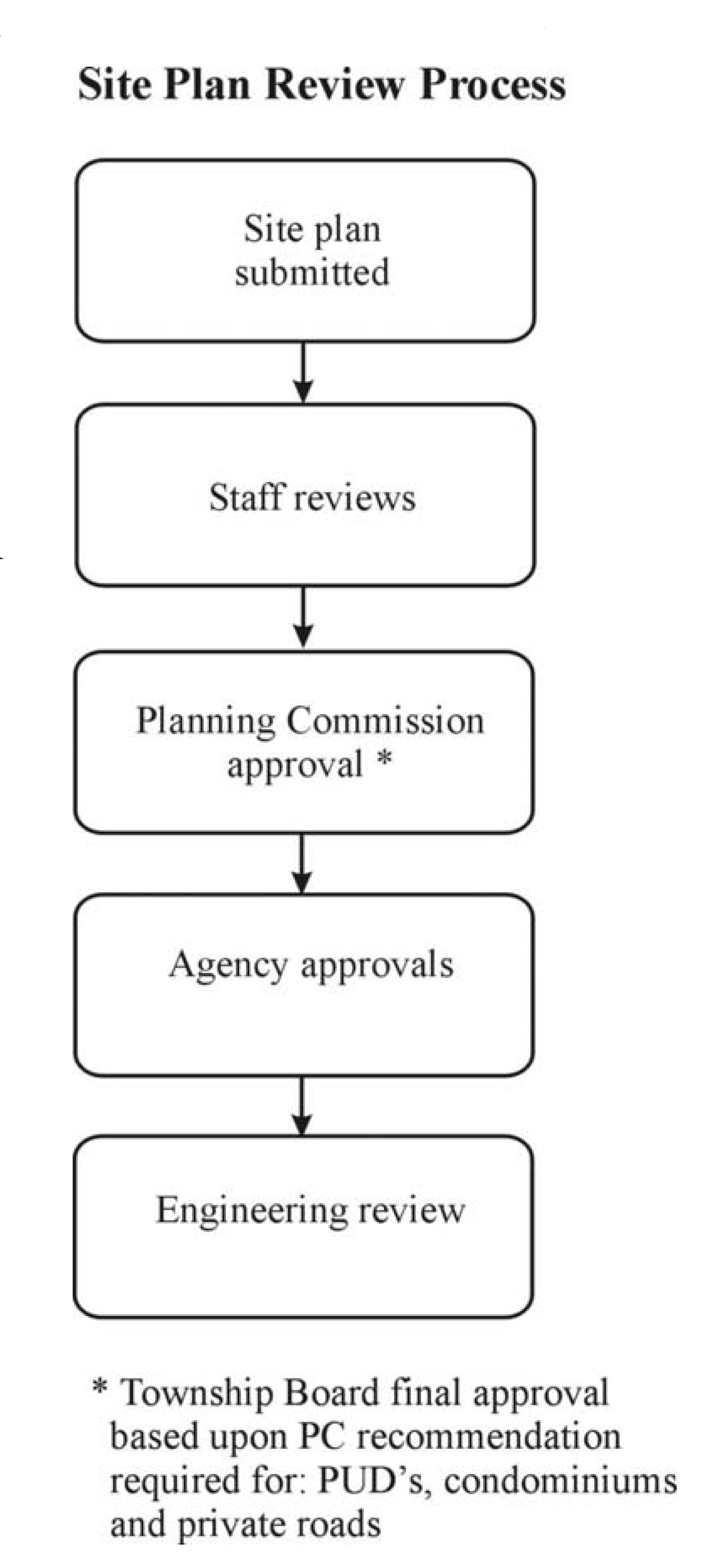 Site plan review and approval shall be required for the following list of proposed types of construction or improvement. The level of approval varies between the township board (TB), planning commission (PC) and administrative (Admin) approval depending upon the extent of construction proposed. Site plans shall include all detailed engineering drawings. Sketch plans are less detailed. Items that are exempt from site/sketch plan approval still require a land use permit. All construction or building modification is subject to building permit requirements.