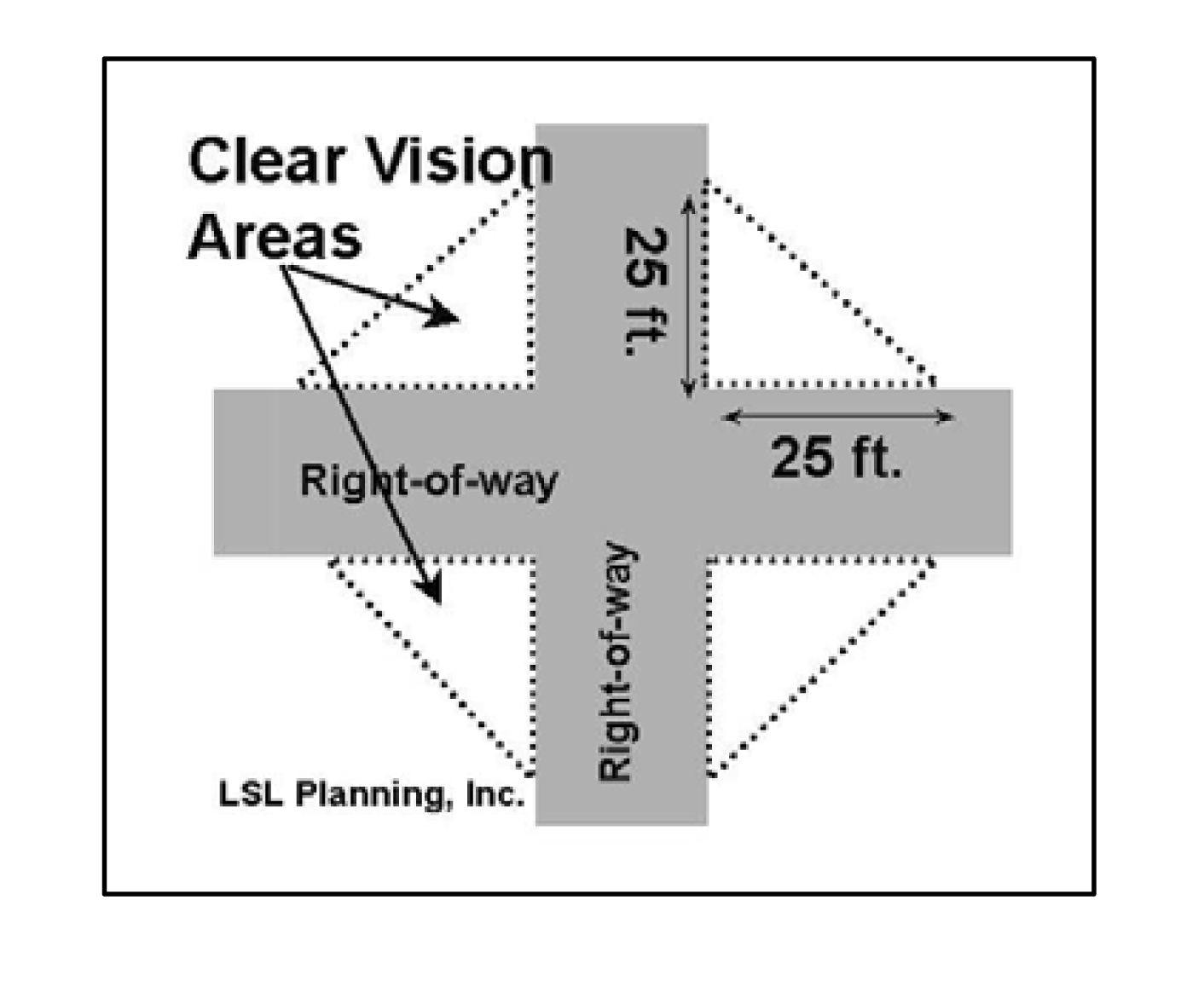 In all districts, no fence, wall shrubbery, sign or other obstruction to vision above a height of 30 inches from the established street grades shall be permitted within the triangular area formed by the intersection of any street right-of-way lines or private road easements by a straight line drawn between said right-of-way lines at a distance along each line of 25 feet from their point of intersection.