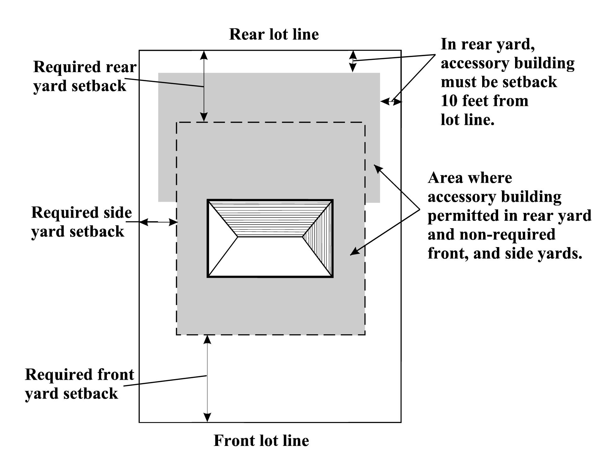 Buildings accessory to residential buildings shall not be erected in any required yard space, except when located in the rear yard. Accessory buildings in the front or side yard shall meet both front and side yard setbacks for the district (sections 38-180, 38-201 and 38-232). Accessory buildings in a rear yard that are up to 200 square feet in area must be setback at least ten feet from any side or rear lot line. Accessory buildings greater than 200 square feet in area meet the rear setback required for the district (sections 38-180, 38-201 and 38-232).