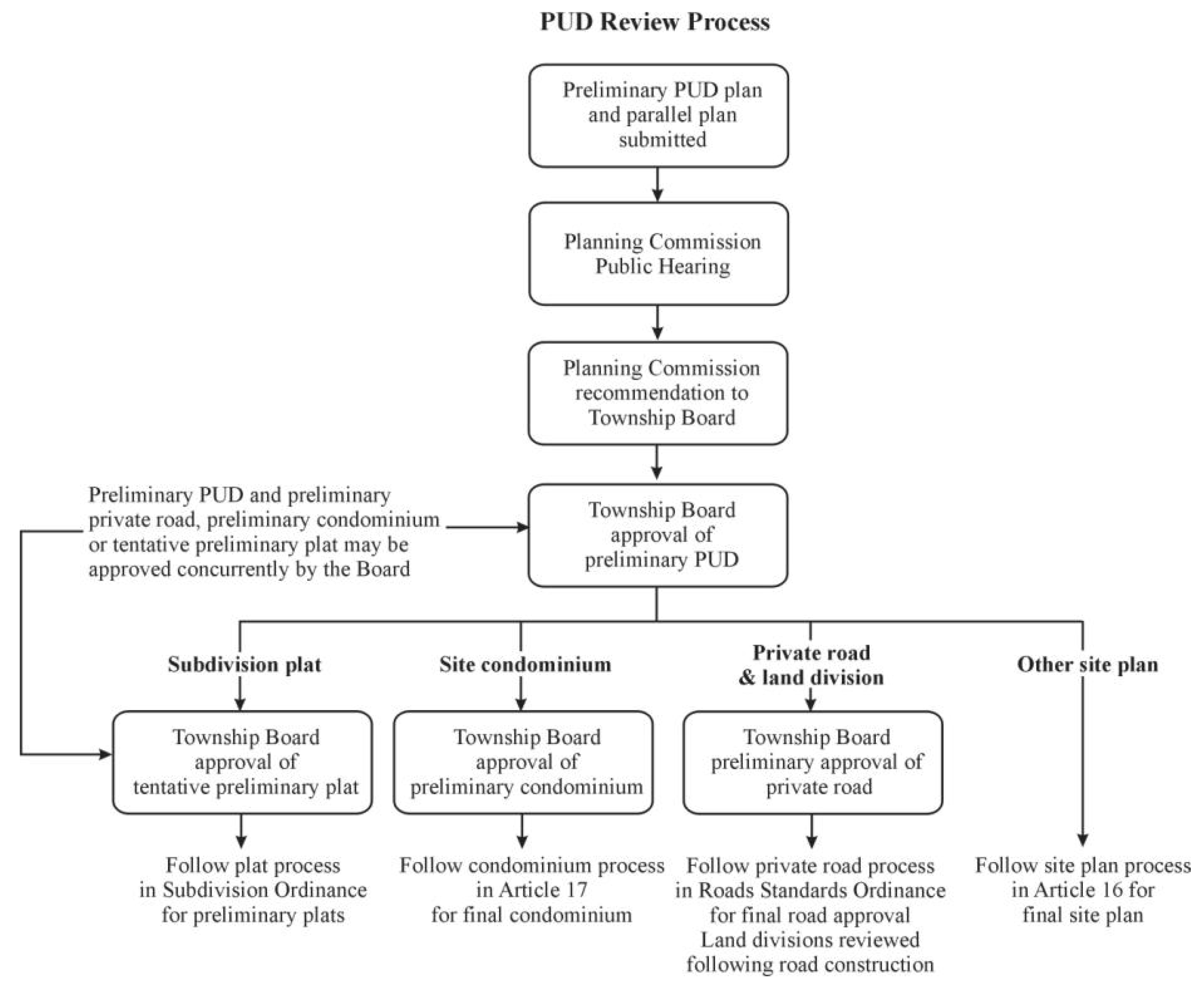Review process. A PUD may be approved by the township board, based upon a recommendation by the planning commission following the review procedures and approval standards of this article and chapter 16, pertaining to land divisions and subdivisions, where a land division or a subdivision is being proposed; article VIII of this chapter, where a condominium is being proposed; or the site plan review regulations, where a private road is being proposed.