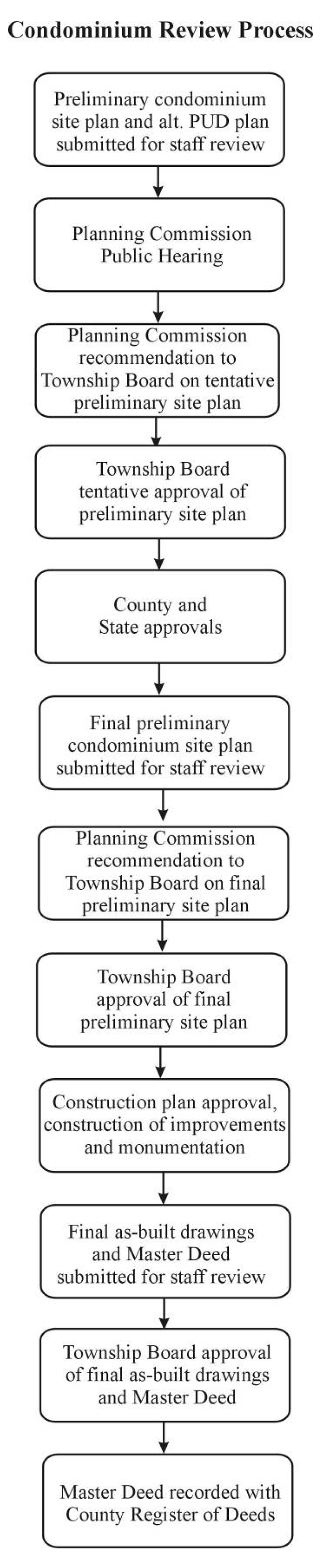 Final approval of master deed, restrictive covenants and as-built survey. The condominium project developer or proprietor shall furnish the township with the following: one copy of the finalized draft of the master deed, one copy of all restrictive covenants and two copies of an as-built survey. The as-built survey shall be reviewed by the township engineer for engineering aspects and the township planner for compliance with township ordinances. The master deed, restrictive covenants and as-built survey shall be approved by the township board. The master deed shall be recorded with the county register of deeds following final approval by the township board.