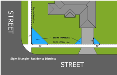 Sight triangle. A triangular-shaped portion of land bounded by the right-of-way lines at the intersection and a line connecting the two (2) points on the subject zoning property in which nothing shall be erected, placed, planted, or allowed to grow in such a manner as to limit or obstruct the sight distance of motorists entering or leaving the intersection.