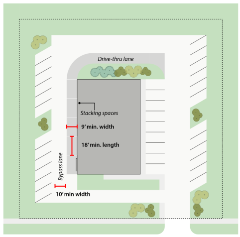 i. All drive-through lanes and stacking spaces shall be no less than nine (9) feet wide by eighteen (18) feet long.