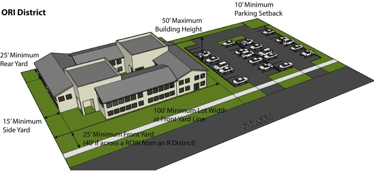 1. Purpose: The ORI District provides a campus-like setting for larger office, research, and light industrial activities in a pleasant, hazard-and-nuisance-free environment. In keeping with this character and reflective of some parts of the District abutting residential properties, a high quality of general and transitional landscape standards is incorporated into the District. As outlined in the 2016 Comprehensive Plan, smaller office users, such as professional and medical office spaces, are also appropriate in this District. These smaller spaces function more like retail in that they need to be near consumers, and common tenants include insurance agencies, relators, doctors, dentists, and attorneys.