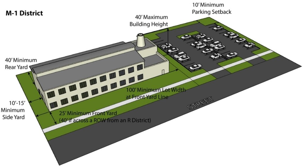 1. Purpose: The M-1 Limited Industrial District supports a variety of manufacturing, warehousing, distribution, logistics, and office uses. Uses in this district are intended to be non-intensive in terms of their impact on nearby uses and the community character overall. Existing buildings range in size and age, and serve a variety of industrial and intensive commercial business operations.