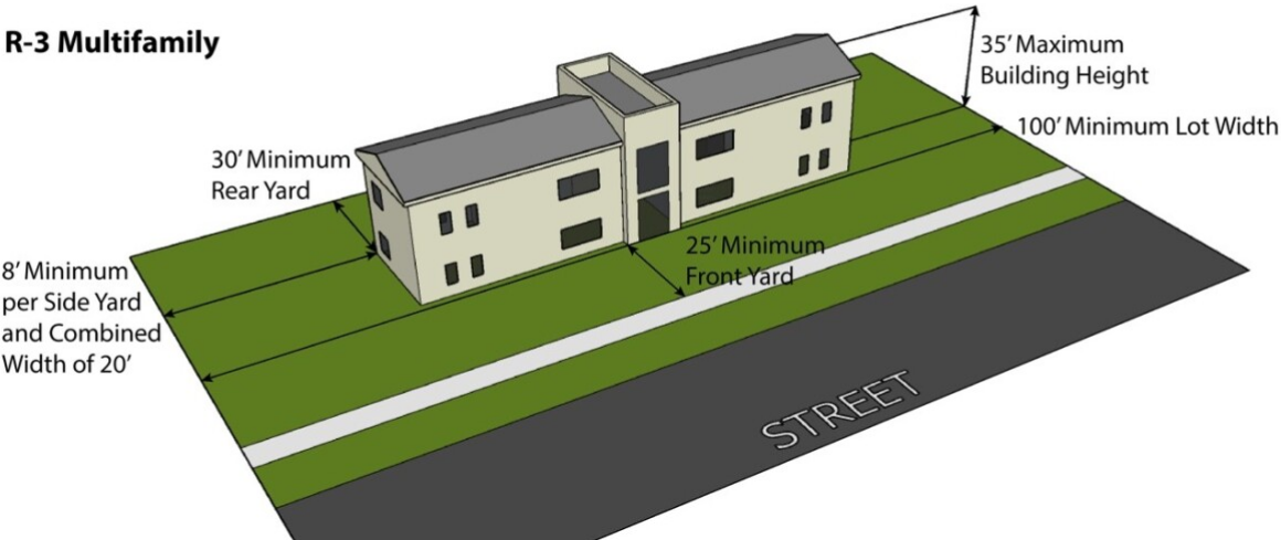 5. Bulk Space and Yard Regulations: Bulk regulations in the R-3 District shall be as specified in Table 3.1 and illustrated in Figures 3-3 through 3-6.