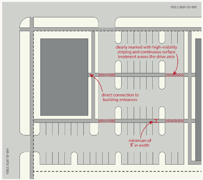c. All parking lots must include walkways that provide direct connections to building entrances from the spaces furthest from the entrance. At least one walkway must provide a direct connection between the building entrances and the adjacent public rights-of-way and associated sidewalk.