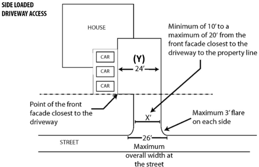 i. The driveway pad (shown as (Y) below) shall be a maximum width of 24 feet from the front of the garage doors.