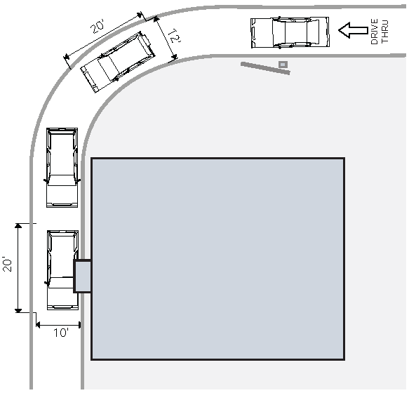 Bank. A bank with a drive-thru must provide a minimum of 3 spaces measured from the teller box.