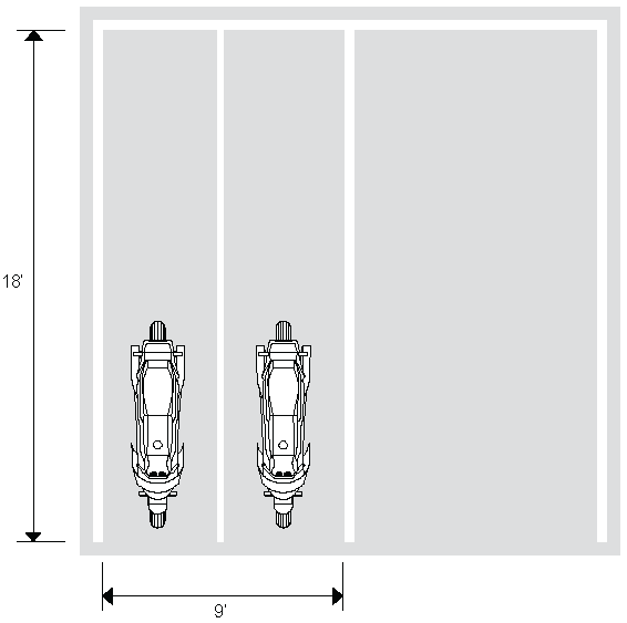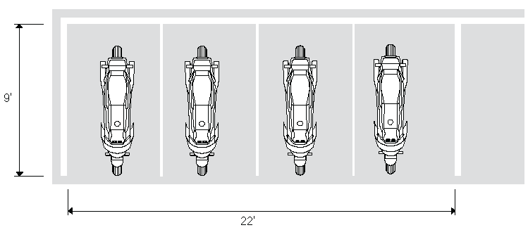 Motorcycle parking spaces may be counted as fulfilling the vehicle parking requirements at the rate of 2 motorcycle spaces for 1 vehicle space (90 degree, head-in) or 4 motorcycle spaces for one vehicle space (parallel). Only the minimum required motorcycle spaces may be used to reduce the vehicle parking requirements.