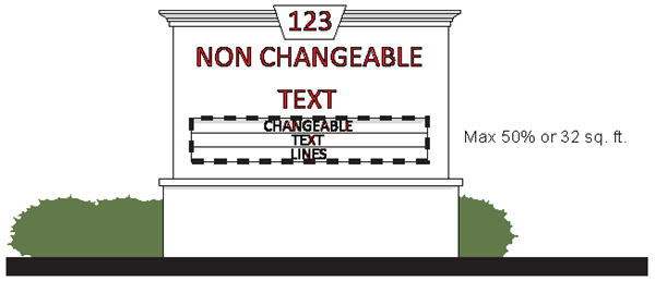 The changeable copy portion of the ground sign can be no greater than 50% of the total sign area, however, in no case can the changeable copy portion of the ground sign exceed 32 square feet in area.