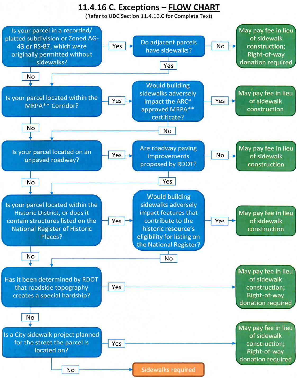 Along public streets where a City sidewalk project is included on the Sidewalk Priority Matrix or has been awarded for construction, the Transportation Director may accept payment to the City of Roswell in lieu of the required installation of the sidewalk and street trees where in his opinion the acceptance of funds would be appropriate. Donation of right-of-way would be required to allow for the installation of a sidewalk in the future.