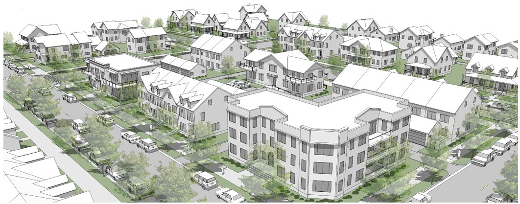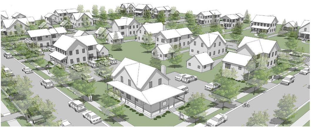DH- is intended for downtown areas that abut roadways transitioning from residential to commercial. The DH- district is intended to accommodate commercial uses while maintaining the residential character of the street, therefore, only detached houses, townhouses, cottage courts, and commercial houses are allowed. DH- implements the Historic Area Town Center/Downtown designation on the Future Development Map of the Comprehensive Plan.