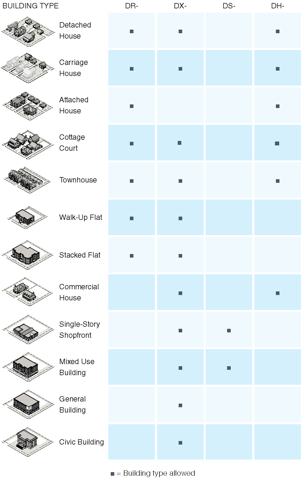 Detached houses, carriage houses, attached houses, cottage courts, townhouses, walk-up flats, commercial houses and single-story shopfronts have maximum height limits that may be lower than the district height limits (see Sec. 5.3.).