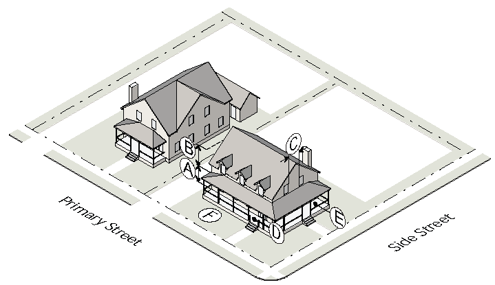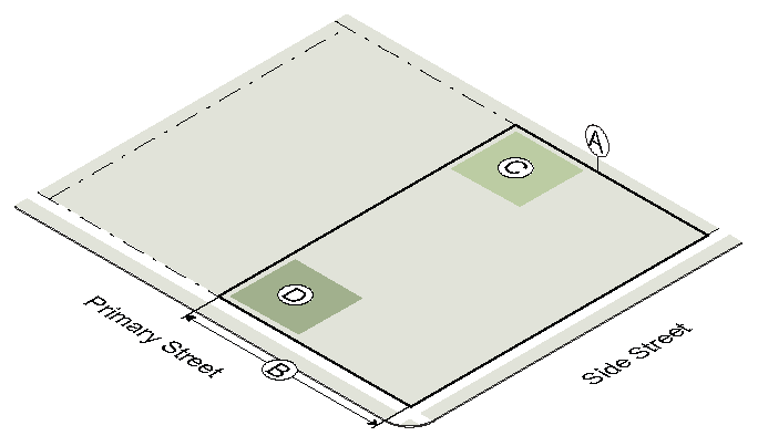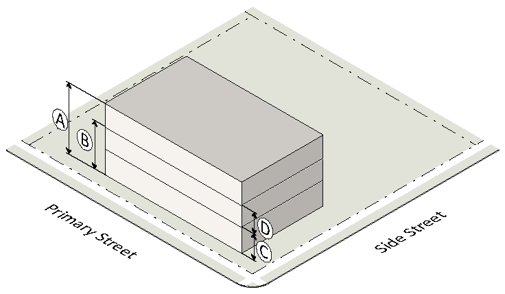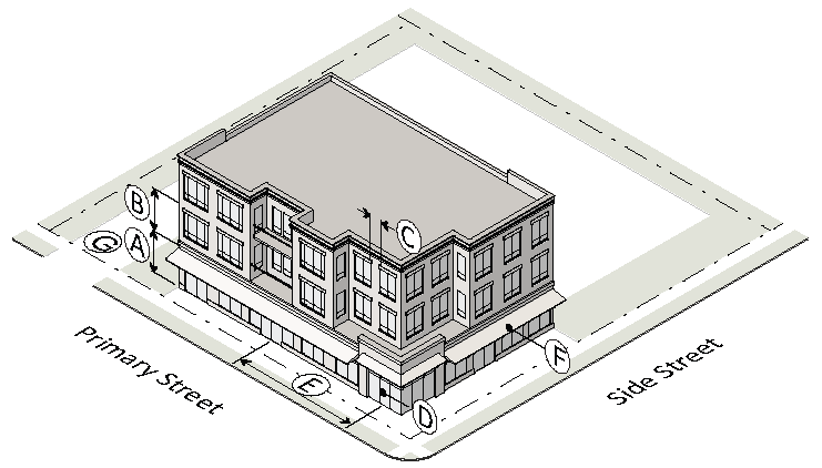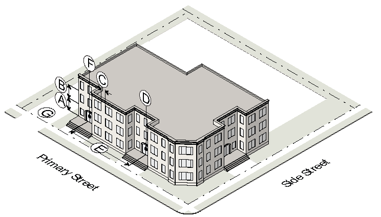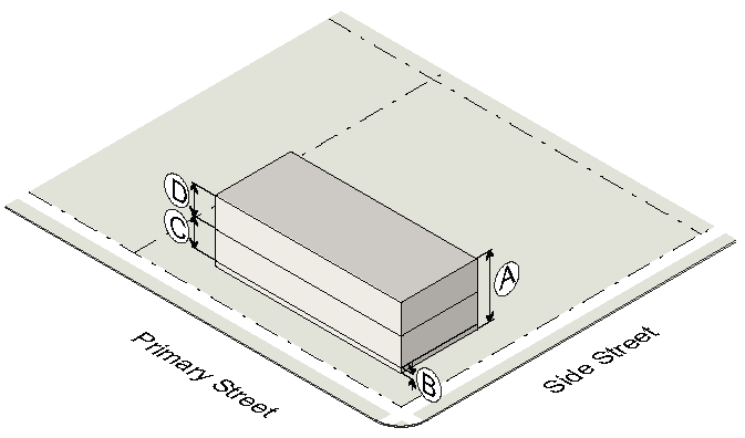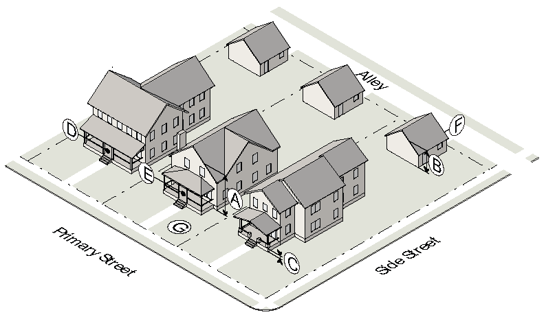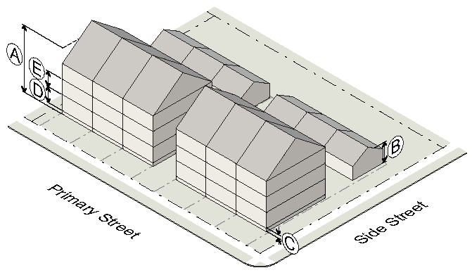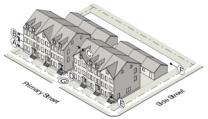 | Ⓐ Principal building (max) | 35' / 2½ stories |