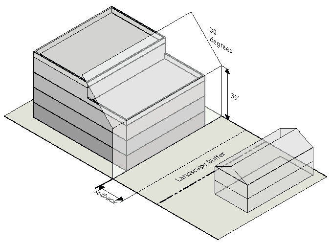 A building must not extend into a 30-degree angular plane projecting over the subject property measured from a height of 35 feet at the side interior or rear setback line. Setbacks are measured from the interior edge of the landscape buffer.