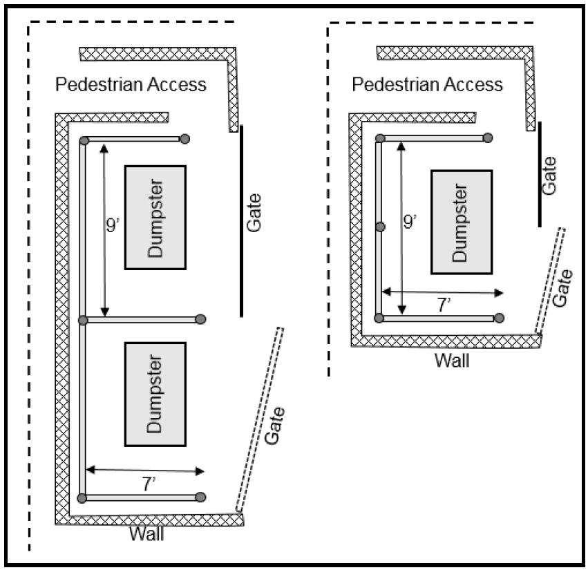 Pipe bollards shall be placed on either side of the sanitation dumpster location at the opening of the enclosure. Therefore, an enclosure with one sanitation dumpster will necessitate five bollards whereas an enclosure with two sanitation dumpsters will necessitate eight bollards. (Please reference figures 52.14.1—52.14.3 below.)