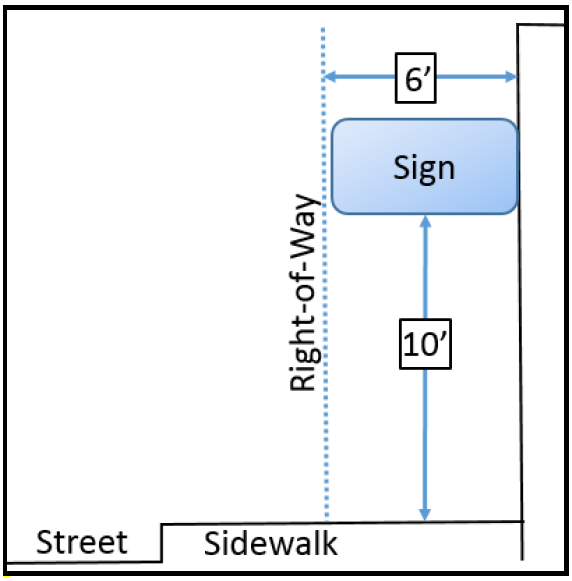 Any non-residential occupancy may erect one attached sign projecting up to a maximum of six feet from a vertical building surface, but not above the roof. The sign shall be located a minimum of ten feet above grade and shall not project into or over any public right-of-way (see Figure 70.4 below), unless approval is obtained from the ROW owner.