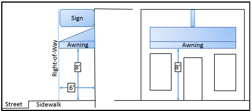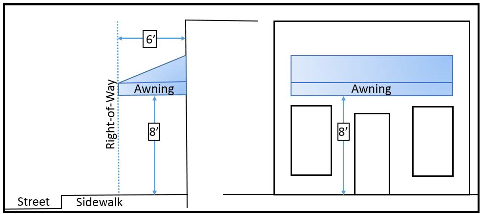 Any non-residential occupancy may erect awnings projecting out to a maximum of six feet from a vertical building surface, but not above the roof, and shall be located a minimum of eight feet above grade and shall not project into or over any public right-of-way (see Figure 70.5 below), unless approval is obtained from the ROW owner.