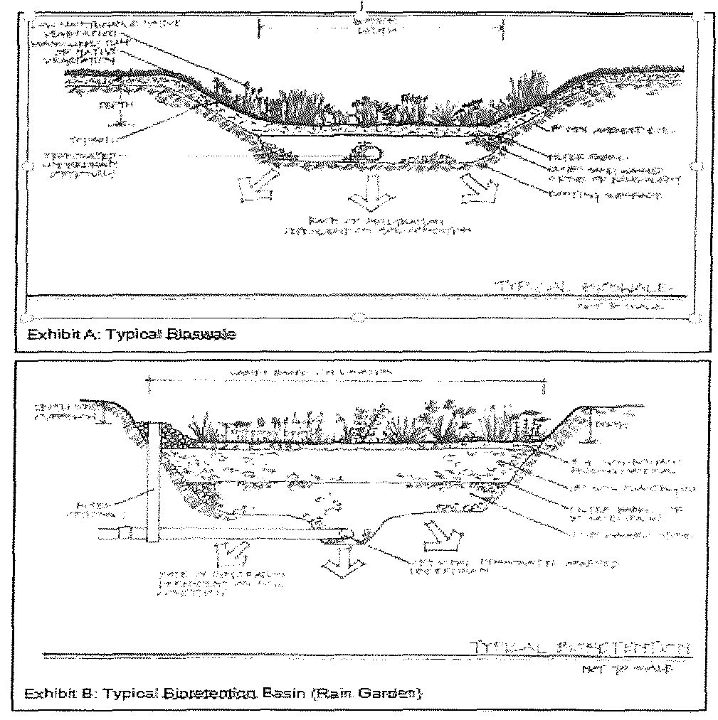 Bioswales and bioretention basins (rain gardens): For on-site storm water management, bioswales and bioretention basins (rain gardens) shall be allowed and generally conform to the design shown in Exhibits A: Typical Bioswale and Exhibit B: Typical Bioretention Basin (Rain Garden) with the final design to be as approved by the village engineer.
