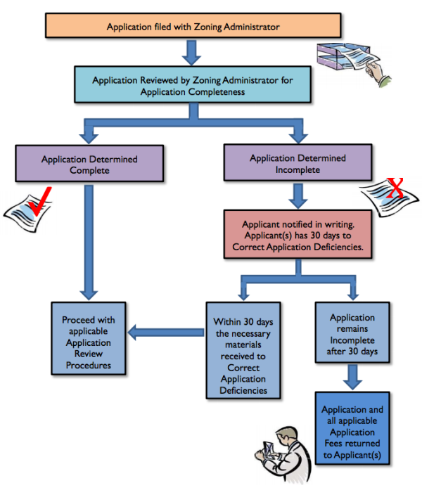 After the receipt of an application, the Zoning Administrator shall determine whether the application is complete, as shown in Figure 12-1. If the Zoning Administrator determines that the application is incomplete, the Zoning Administrator shall notify the applicant in writing, identifying the deficiencies of the application, and advising the applicant that no action will be taken by the City until the deficiencies have been corrected.