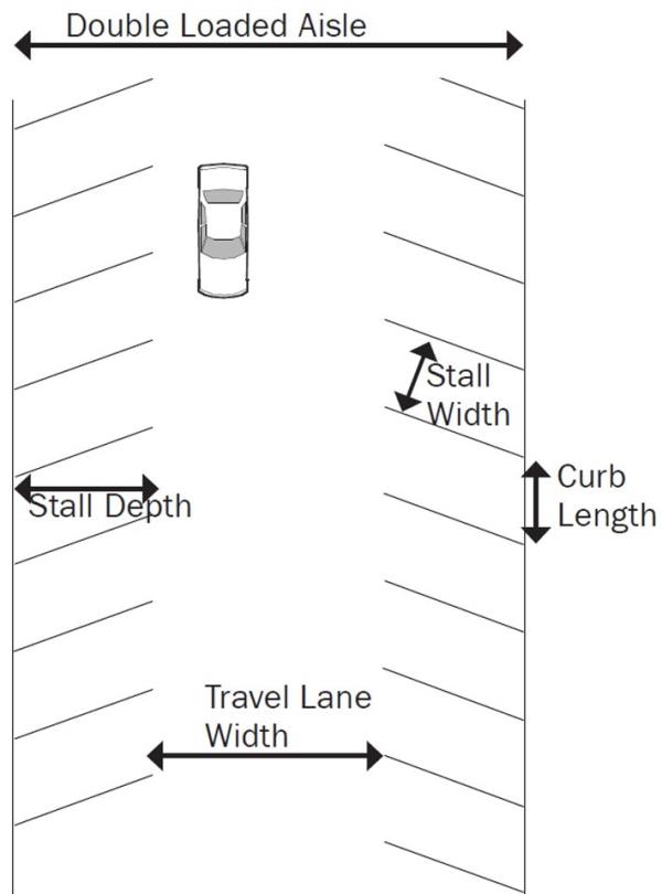 | Angle (degrees) | Curb Length (Feet) | Stall Width (feet) | Stall Depth (feet) | Travel Lane Width One-Way (feet) | Travel Lane Width Two-Way (feet) |