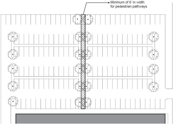 iv) Pathway Delineation. Pedestrian pathways should be clearly marked with striping or through the use of alternative materials, such as pavers. Refer to Figure 6.3 (2).