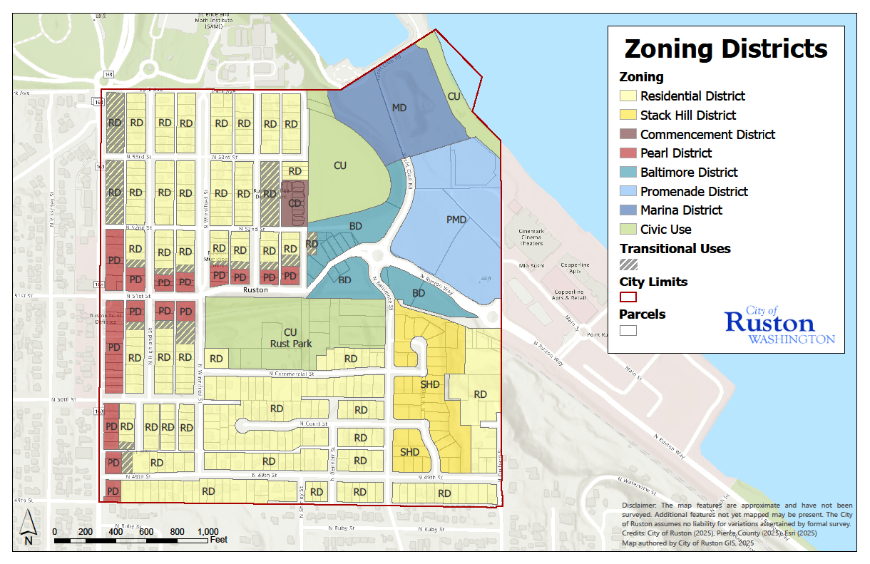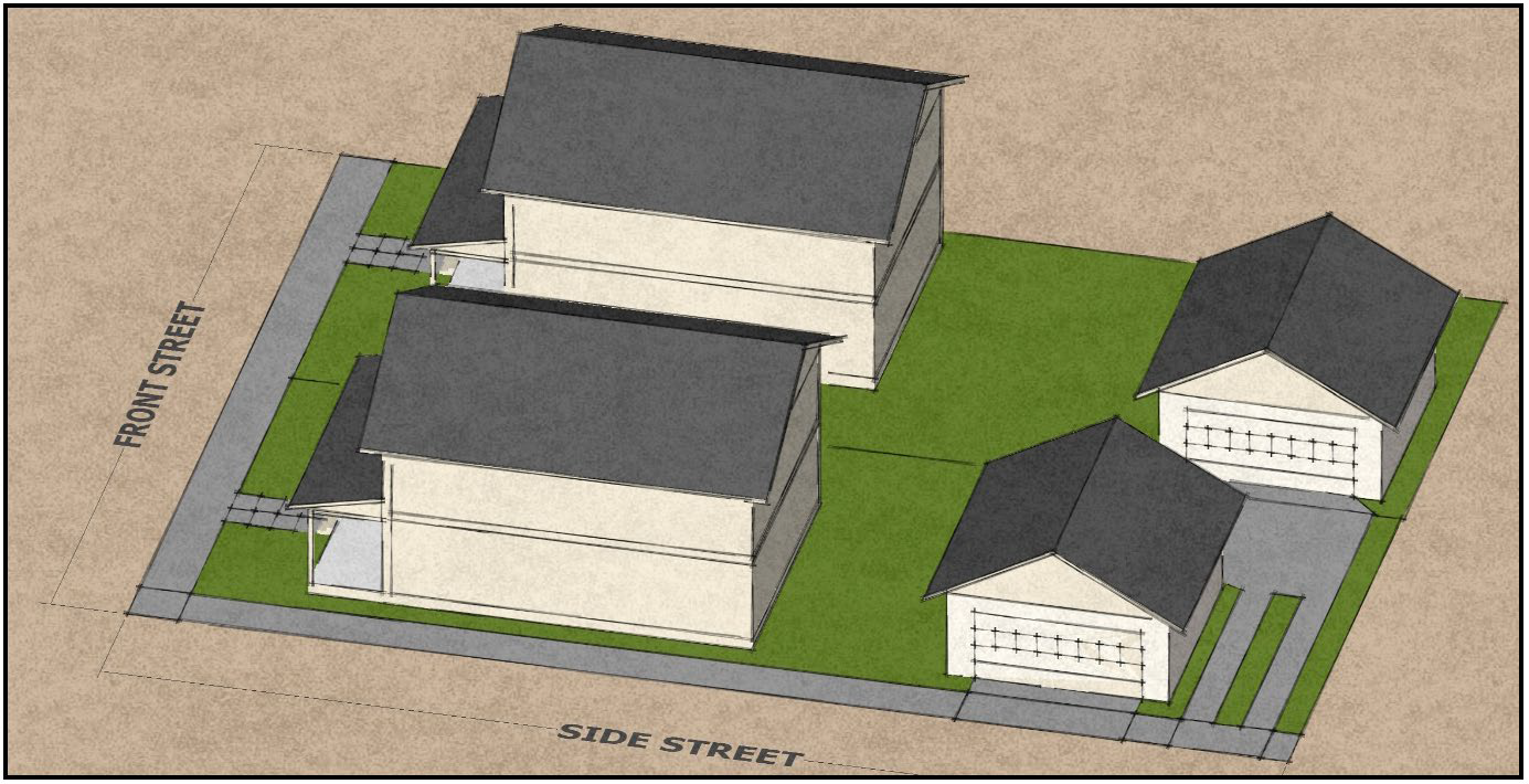 Illustrations and Intent. The Residential District is zoned primarily for residential uses. This district is represented by Ruston's traditional residential-style buildings with small front, side, and rear yards along tree-lined streets. Structures are one to two stories in height with front porches and pitched roof forms. Neighborhoods include single-family homes, middle housing units, and accessory dwelling units. Home occupations and accessory dwellings are encouraged where impacts to nearby residential uses are minimized. Pedestrian-oriented street-side facades with clear entries and front porches are a high priority. Vehicle access is limited to on-street parallel parking and alleys where available.