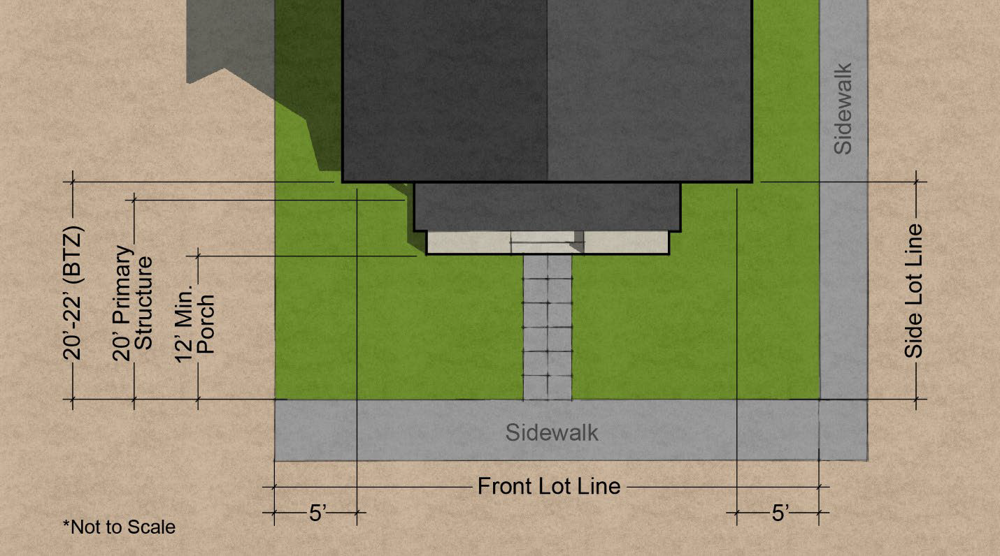 The primary structure minimum setback is 20 feet from the front lot line. The primary structure (BTZ) is located between 20 and 22 feet from the front lot line. At least 50 percent of the ground floor front facade of the primary structure must be located within the BTZ.