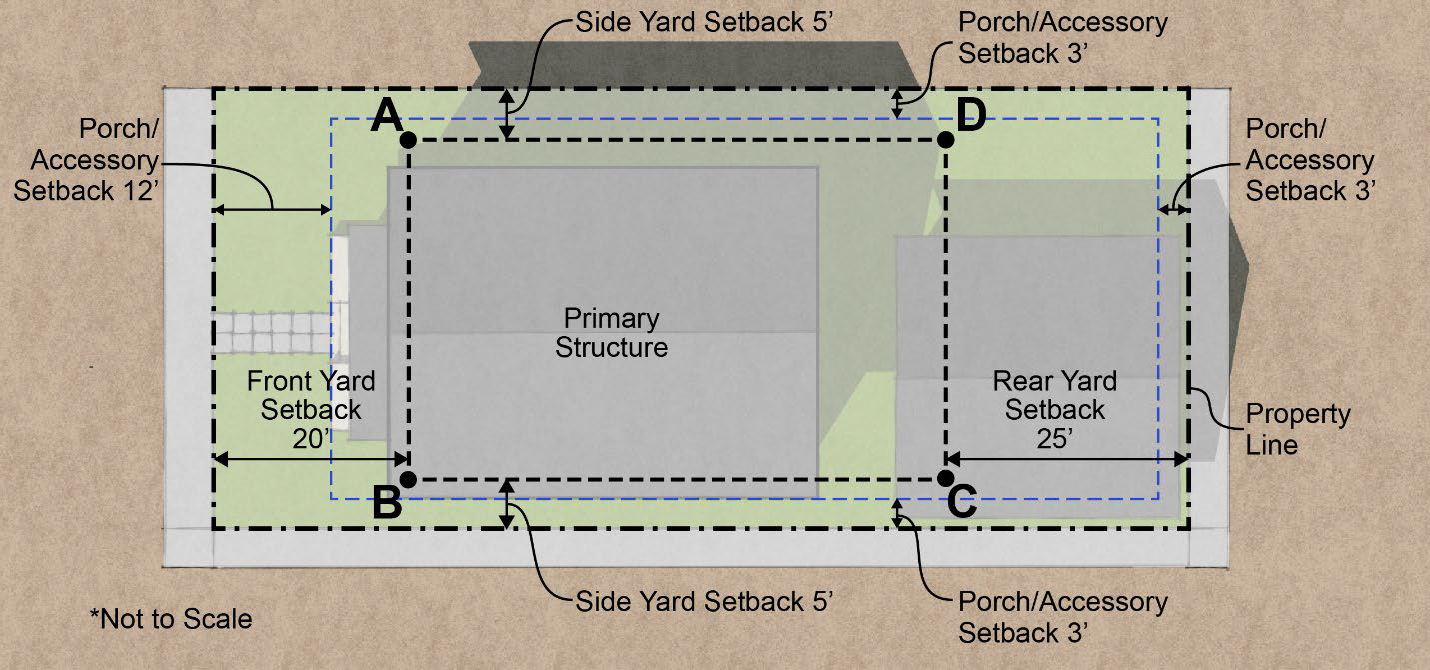 Primary structures, attached garages and porches, must be set back a minimum of five feet from the side yard, with a combined total of ten feet of setback space for both side yards. Existing lots of record which do not comply with the minimum lot width may reduce the combined total side yard width to no less than ten feet.