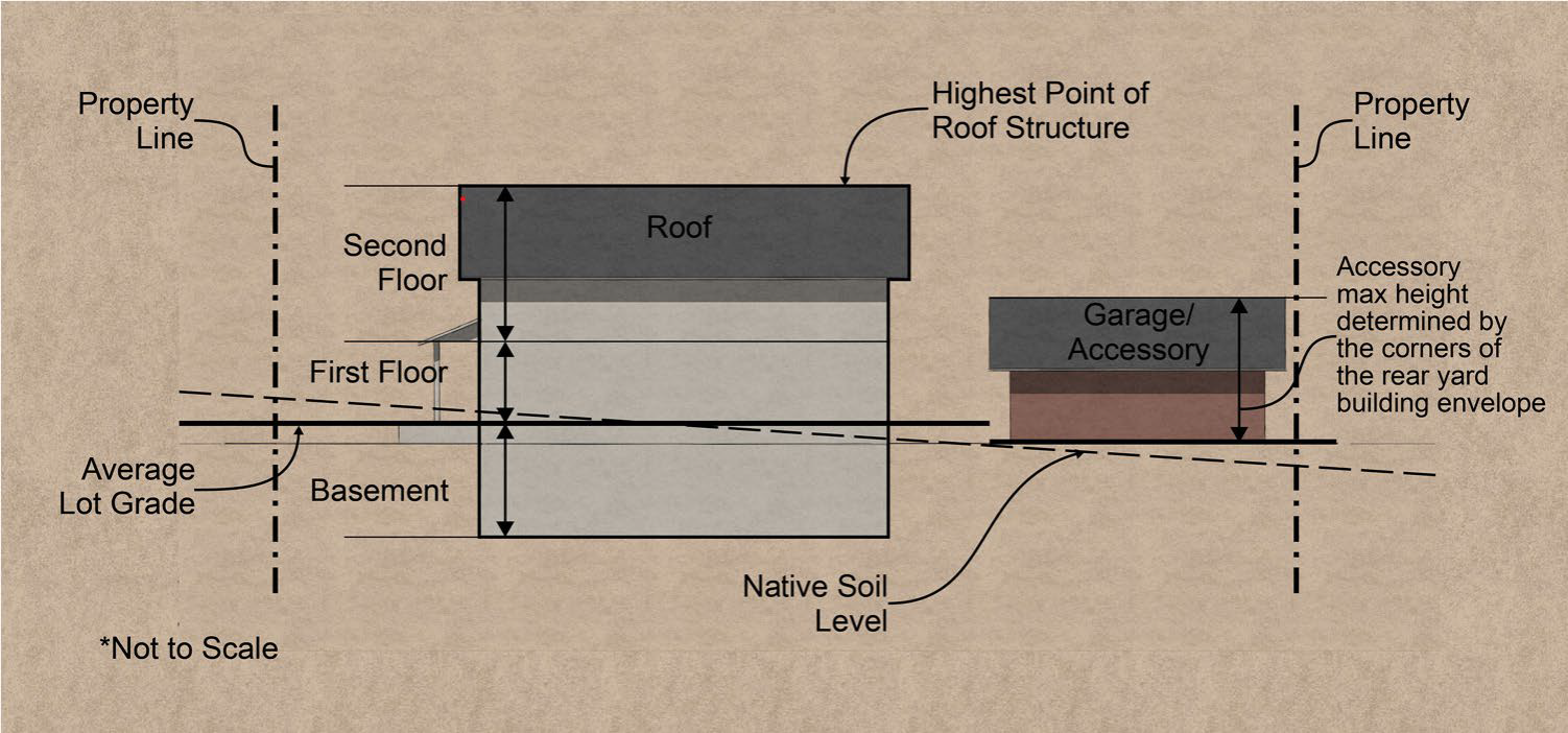 No accessory building, including detached garages, shall exceed 18 feet in height as measured from the lot grade. This height limitation does not apply to accessory dwelling units. For the accessory buildings, lot grade will be determined by the corners of the rear yard building envelope defined in subsection (k) of this section. The following diagram illustrates subsection (f) of this section:
