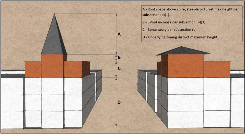 Spires, steeples, clock towers, bell towers and turrets incorporated within the bonus story space provided in subsection (b) above which are between 250 square feet and 650 square feet in area may project an additional five feet above the maximum height level.