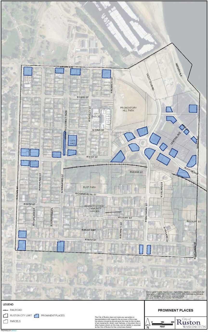Prominent Places Map. The "Prominent Places Map" is adopted as part of the Ruston Zoning Code and those parcels so designated on the map are subject to the requirements of this section. The locations shown on the Prominent Places Map are designated as "Prominent Places" in the Ruston Zoning Code and those parcels shall be allowed to exceed underlying zoning district standards as described in subsection (b) below.