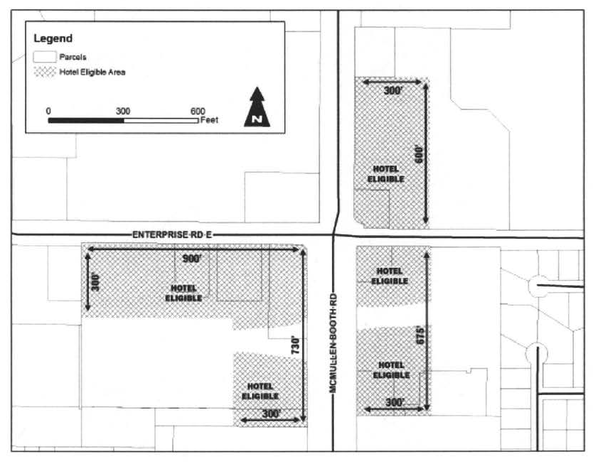 For properties located west of McMullen Booth Road and south of Enterprise Road, hotels shall be within 300 feet of Enterprise Road and within 900 feet of McMullen Booth Road, or within 300 feet of McMullen Booth Road and within 730 feet of Enterprise Road, to be measured from the nearest right-of-way line.