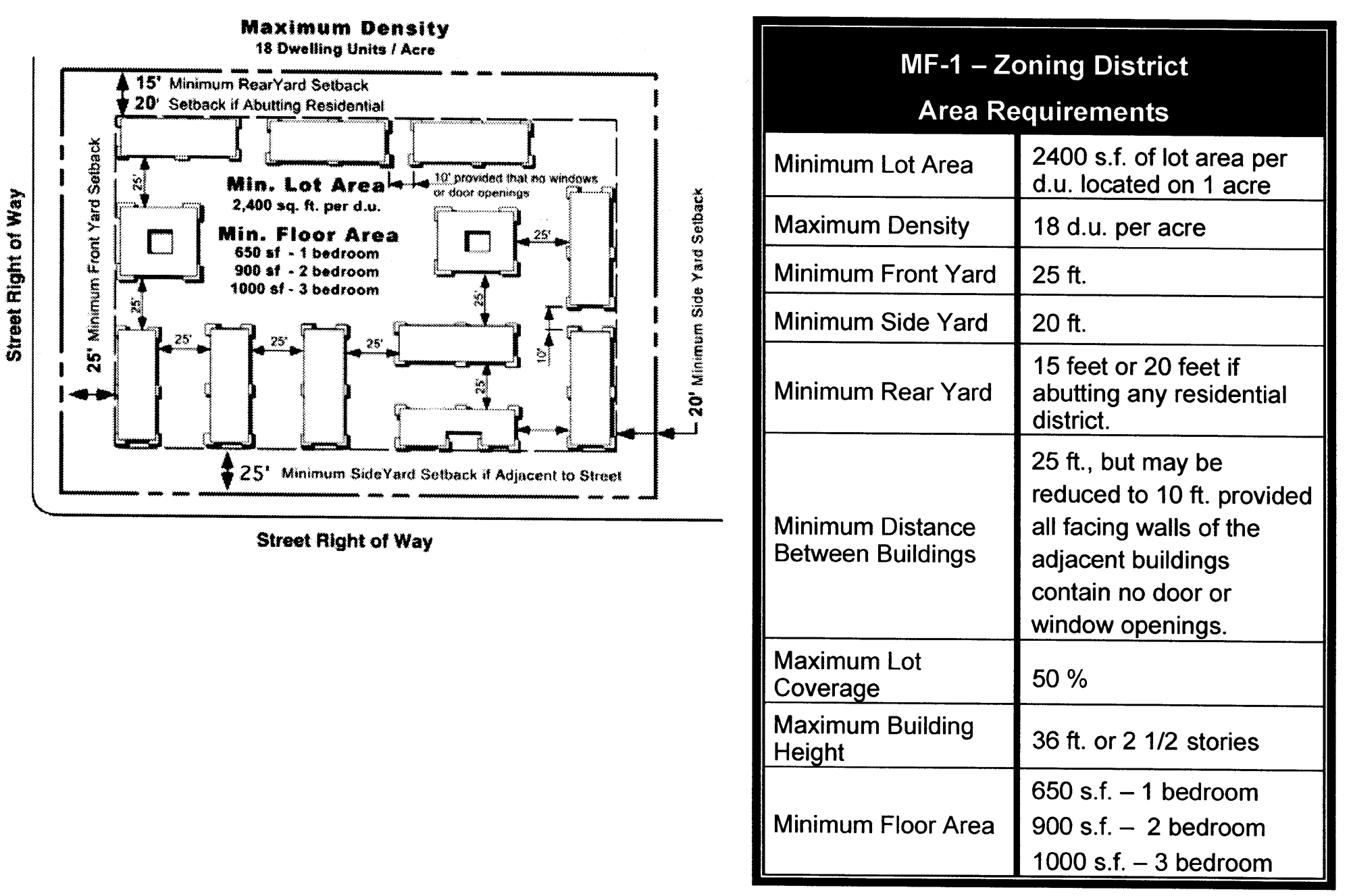 Area requirements. The requirements regulating the minimum lot size, minimum yard size (front, side, and rear), maximum building height (stories and feet), and maximum lot coverage, and minimum floor area, as it pertains to this district, shall conform with the provisions provided in the density, area, yard, height, and lot coverage requirements for the MF1 zoning district.