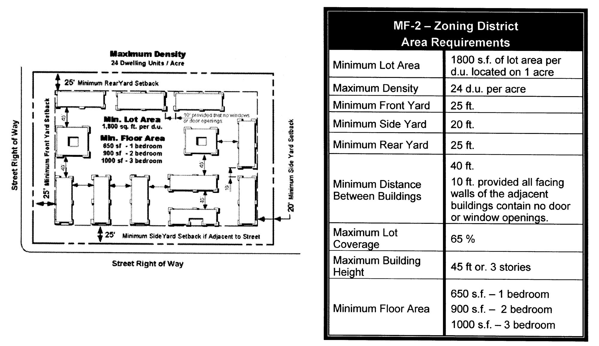 Area requirements. The requirements regulating the minimum lot size, minimum yard size (front, side, and rear), maximum building height (stories and feet), and maximum lot coverage, and minimum floor area, as it pertains to this district, shall conform with the provisions provided in the density, area, yard, height, and lot coverage requirements for the MF2 zoning district.