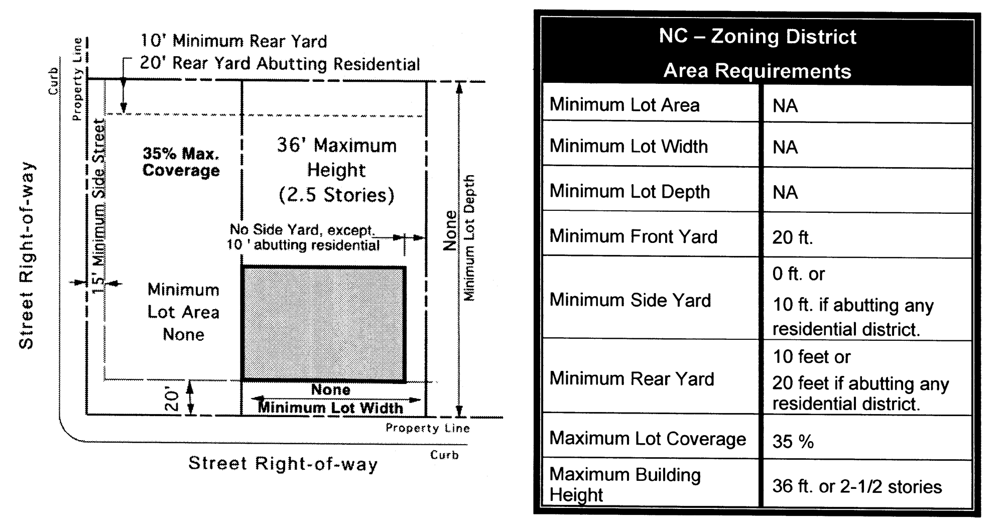 Area requirements. The requirements regulating the minimum lot size, minimum yard size (front, side, and rear), maximum building height (stories and feet), and maximum lot coverage, and minimum floor area, as it pertains to this district, shall conform with the provisions provided in the density, area, yard, height, and lot coverage requirements for the NC zoning district.