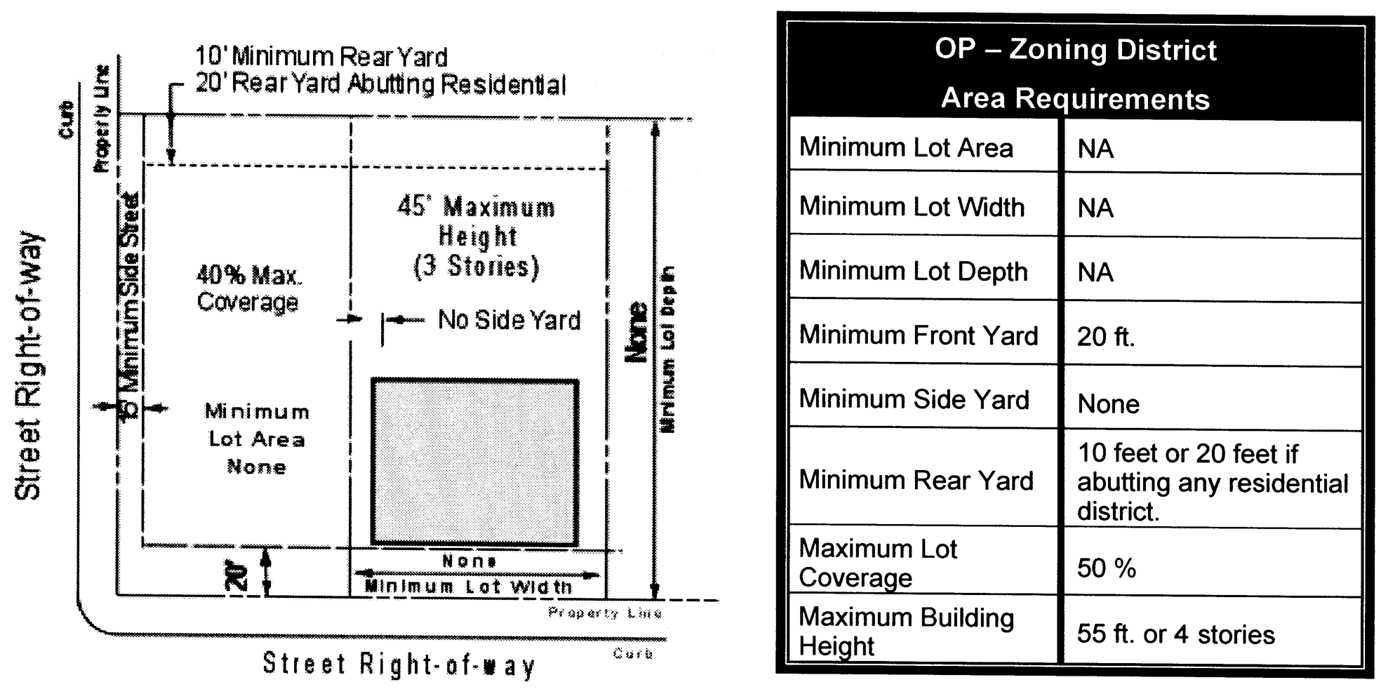 Area requirements. The requirements regulating the minimum lot size, minimum yard size (front, side, and rear), maximum building height (stories and feet), and maximum lot coverage, and minimum floor area, as it pertains to this district, shall conform with the provisions provided in the Density, Area, Yard, Height, and Lot Coverage Requirements for the OP Zoning District.